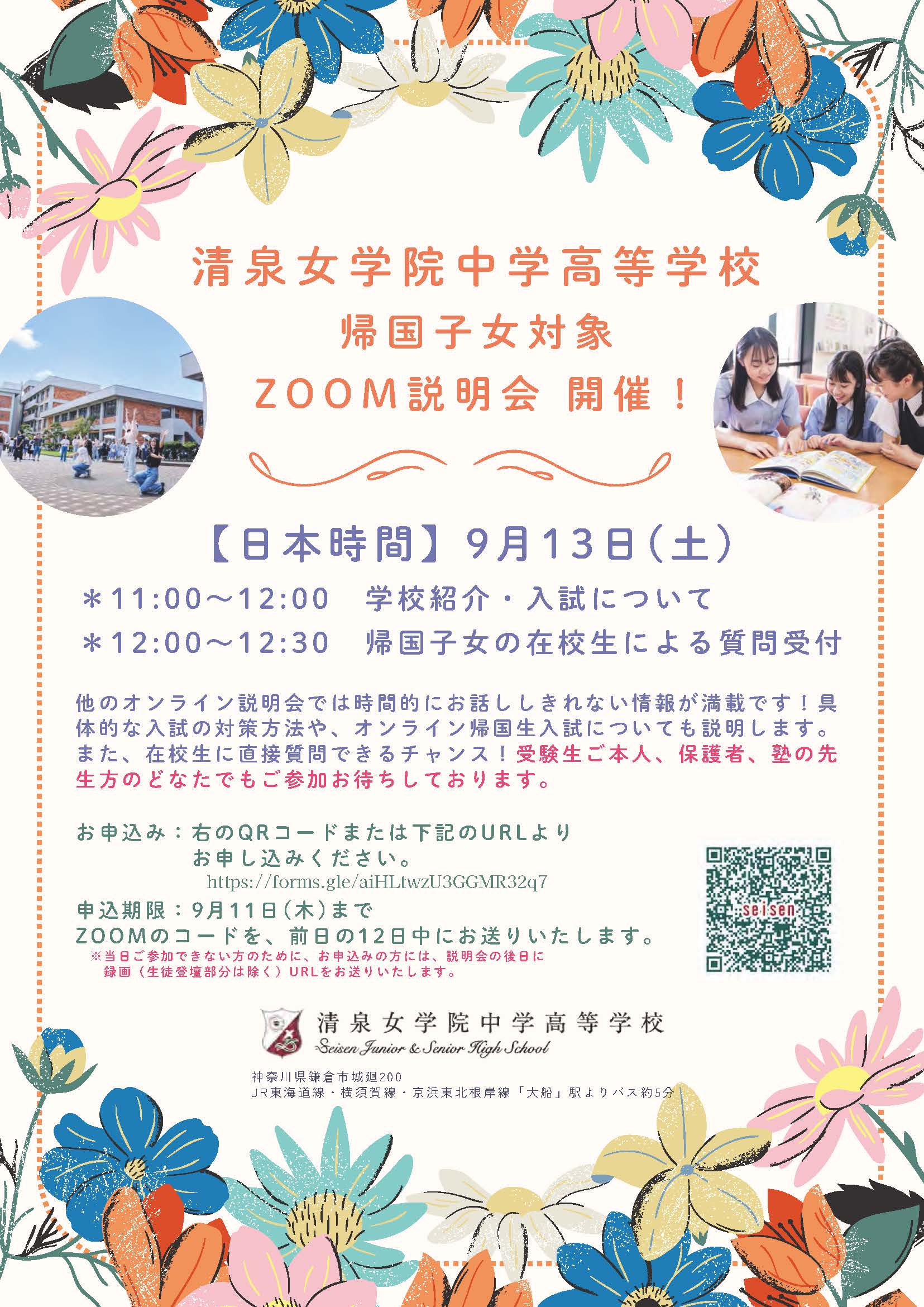 清泉学園女学院中学校高等学校様が、帰国子女対象のZoomでの学校説明会を開催されます。奮ってご参加ください。